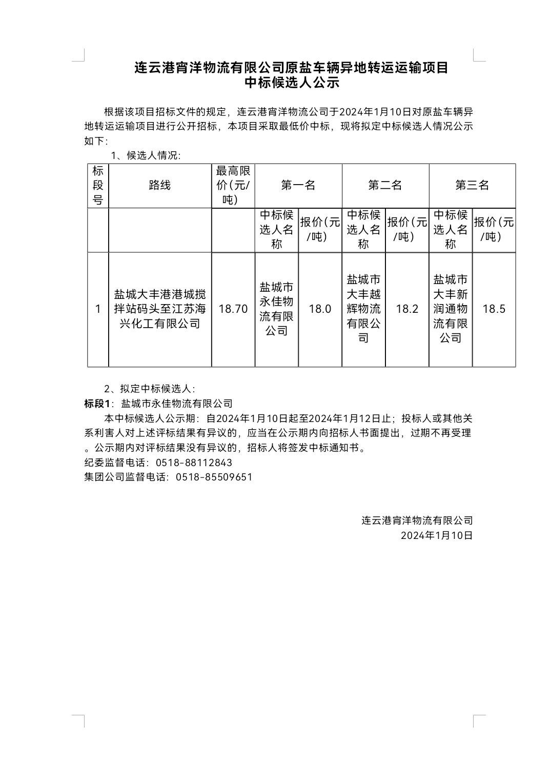 连云港宵洋物流有限公司原盐车辆异地转运运输项目中标候选人公示