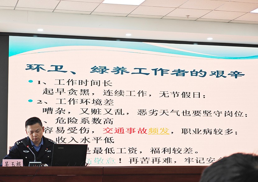 培训过程中,与会人员观看了交通事故案例相关视频,吴教导员详细分析了交通安全防护不到位、工作环境恶劣等种种因素,结合公司实际,非常专业地提出了环卫、绿化工作各项交通注意事项,分别从着装、车辆、装备、环境、身体等几个方面进行了细致入微地讲解。