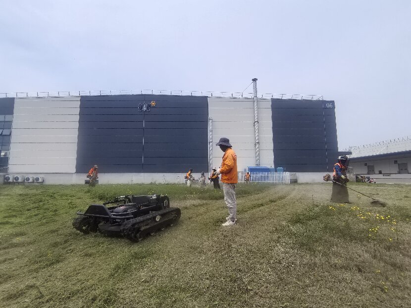 为实现“又快又好”的清理效果,突击队创新采用人工精细整治与遥控割草机智能作业相结合的方式,快慢互补、点面兼顾。遥控割草机高效推进大面积草坪修剪,党员与生产骨干手持工具,对边角、绿化带、活动路线沿线等机械难以覆盖区域进行精细化清理,彻底清除杂草、枯枝、碎石及各类卫生杂物,确保草坪平整美观、路线干净整洁。